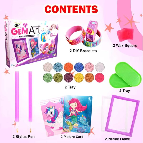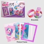 “This 2-in-1 Gem Art Craft Kit is more than just an art set—it’s an opportunity for your child to engage in two incredible projects that will allow them to express themselves while honing their fine motor skills. Whether your child is interested in diamond painting or friendship bracelet making, this kit has something for everyone. With the diamond painting component, children can follow the easy-to-understand instructions to create colourful, sparkling artwork using tiny 5D diamonds. The mermaid and unicorn designs offer the perfect backdrop for your child to immerse themselves in the glittering world of gemstones. Not only will they have fun, but they will also gain confidence as they complete beautiful and shiny creations that they can display proudly! The second half of this kit focuses on making friendship bracelets, a timeless and personal craft. Your child can use the included gemstones to design their very own bracelets, learning the basics of weaving and creativity while adding their own flair. They can make the bracelets for themselves, share them with family and friends, or even use them as heartfelt gifts for their loved ones. One of the standout features of the 2-in-1 Gem Art Craft Kit is the impressive quantity of over 3000+ 5D diamonds that come with the kit. These sparkling gems are the key to creating dazzling, multi-dimensional designs that truly stand out. The diamonds come in a range of bright and vibrant colours, making it easy to bring the unicorn and mermaid designs to life with intricate, eye-catching patterns. The 5D diamond experience adds a unique and fun twist to traditional craft kits. Each diamond has a flat bottom and a faceted top, creating a 3D effect once applied to the canvas. This technique results in stunning, textured artwork that captures light in a way that traditional paint or markers simply can’t achieve. The added sparkle and shine of these diamonds help enhance your child’s creations, ensuring they have a lasting piece of art to be proud of. While this craft kit is perfect for individual play, it also serves as a great bonding activity for friends and family. Your child can invite a friend over for a creative session, where they can both design their own unique pieces of art or make friendship bracelets to swap. Group play helps build teamwork and social skills as kids collaborate and share ideas. The unicorn and mermaid designs are appealing to a wide age range, making this kit suitable for siblings or friends with different ages and skill levels. Kids can spend time together, creating beautiful pieces while enjoying quality bonding moments. This Kit makes an excellent gift for birthdays, holidays, or as a fun rainy-day activity. Children who love crafts, arts, and jewellery will be thrilled to receive this kit, and it offers a perfect way to engage them in a constructive and creative way. Whether your child is already a fan of DIY projects or is new to the world of crafting, this kit will keep them entertained and engaged for hours. Plus, the ability to create something so beautiful and sparkly will leave them feeling accomplished and proud of their work. Safety is always a top priority when it comes to children’s products. Rest assured that the 2-in-1 Gem Art Craft Kit has been designed with safety in mind. All materials included are non-toxic and child-safe, so you can feel confident about giving this kit to your child. Additionally, the eco-friendly packaging ensures that your little one can enjoy their creative experience while being mindful of the environment. What’s Included in the Kit? 3000+ 5D diamonds in various colours DIY Gem Painting canvas featuring unicorn and mermaid designs Friendship bracelet-making kit with adjustable bracelets and design materials Diamond placement pen tool for easy application Instruction guides for easy-to-follow step-by-step assembly Storage containers to keep the diamonds organized