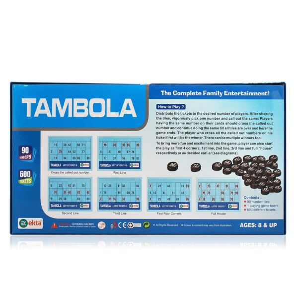 Tambola the complete family entertainment we bring to you fun-filled educational products from ekta, to entertain your growing children while they learn and shine. The exclusive range of their activity kits aim at making your children more confident and assist them to gain a deeper understanding of basic principles of art and science, in a creative manner. A game finally to entertain your child, your family and yourself. This tambola game is a complete entertainer for long hours. All you need to do is distribute the tickets with numbers to the players. The player who crosses all the called out numbers is the ultimate winners of this game. This game can have multiple players too. Tambola is one of the easiest indoor games and can be played anywhere easily. Contents 90 number tiles 1 playing game board 600 different tickets.
