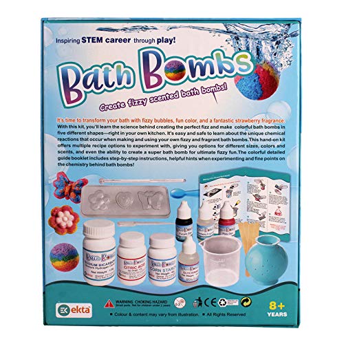 Ekta Bath Bombs| Indoor Game for Kids, With this kit, you’ll learn the science behind creating the perfect fizz and make colourful bath bombs in five different shapes-right in your own kitchen. Sodium Bicarbonate (Hydrogen Sodium Carbonate) (100 g.), Citric Acid (50 g.), Cornstarch (40 g.), Glycerine (Glycerol Solution) (20 ml.), Large measuring beaker, 4 different shaped bath bomb plastic moulds, Spoon, Wooden sticks, Pipette, 2 bottles of liquid food colouring & detailed instructions. Improves creativitiy, productivity and project management skills This item is perfect for gift purpose on the occassion of christmas, Diwali, thanksgiving, Birthday, Party, kids, niece