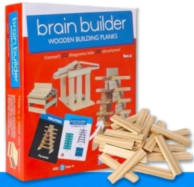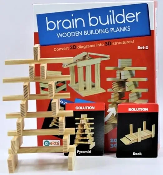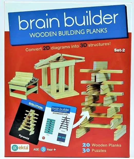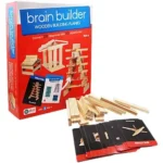 Train young brains to think in multiple dimensions with this interactive STEM tool! Brain Builder combines 20 wooden planks with a set of stimulating puzzle cards. Perfect for even the youngest of builders-each card features a fun, recognizable 2-D object and the goal is to recreate the pattern into a 3-D structure. The picture cards are numbered in order of difficulty-ranging from beginner to expert. Manipulate the wooden planks to successfully duplicate the balance, proportion, composition and geometry featured on each card. With each build becoming more challenging, patience and confidence is gained through trial and error. From picnic tables and bridges to dragonflies and triangles, you will be amazed what your brain will build! Don’t stop there! After mastering the 40 patterns, use your imagination to create your own designs or tackle the original Brain Builder! Includes 20 precision-engineered wooden planks & 20 double-sided puzzle cards. Easy and clear instructions are provided