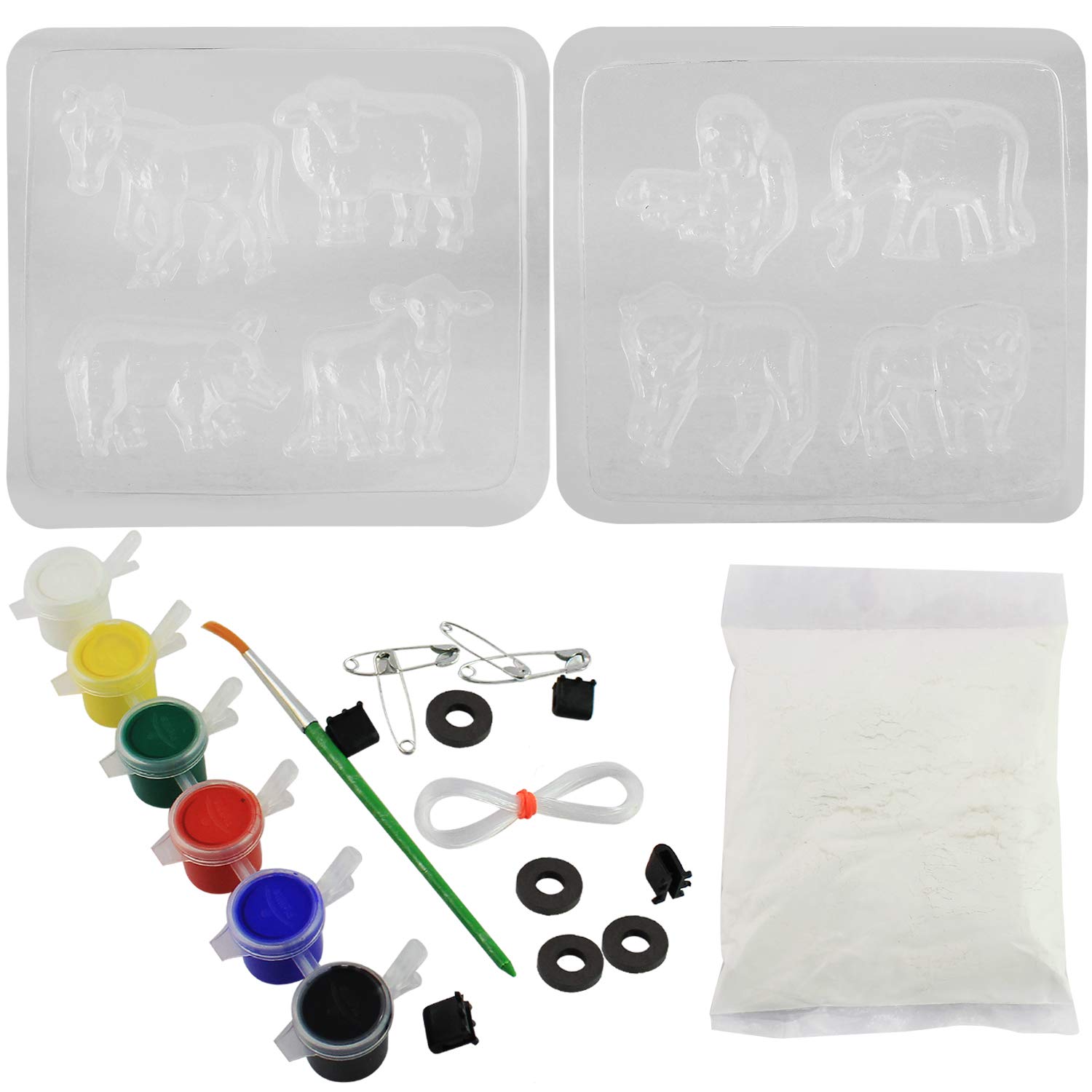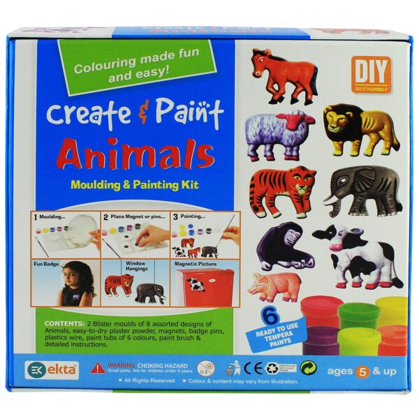 Blister moulds of 8 assorted designs of animals. Easy-to-dry plaster powder, magnets, badge pins, plastics wire, paint tube of 6 colours, paint brush and detailed instructions.