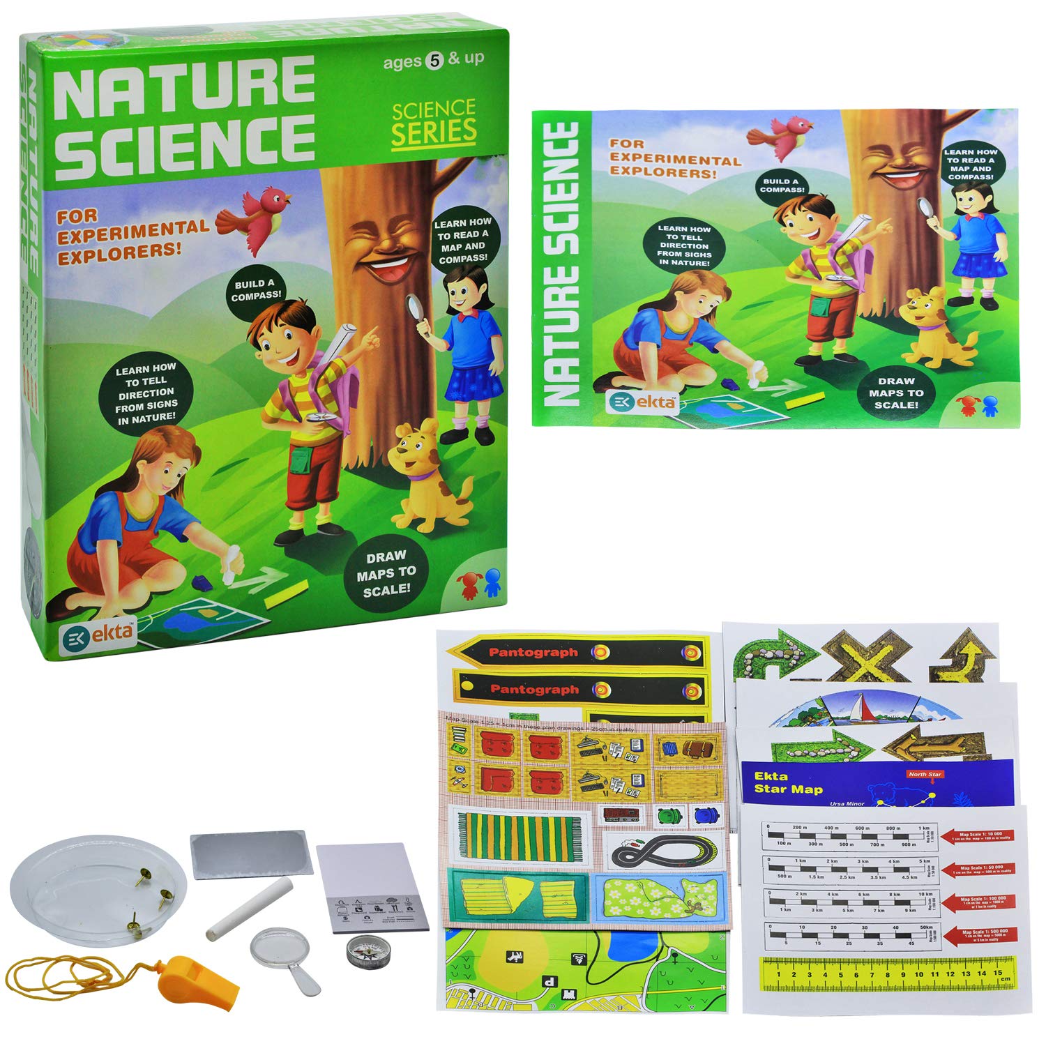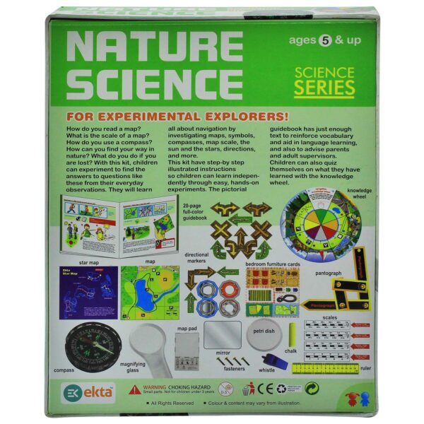 Nature Science is a kit of science series for Nature Experimental Explorers. How do you read a map? What is a scale of a map? How do you use a compass? How can you find your way in nature? What do you do if you are lost? With this kit, children can experiment to find the answers to questions like these from their everyday observation. They will learn all about navigation by investigating maps, symbols, compasses, map scale, the sun and the stars, directions, and more. This kit have step by step illustrated instructions so children can learn independently through easy, hands on experiments. The pictorial guidebook has just enough text to reinforce vocabulary and aid in language learning, and also to advise parents and adult supervisors. Children can also quiz themselves on what they have learned with the knowledge wheel. Key Features:- Children will learn all about navigation by investigating maps, symbols, compasses, map scale, the sun and the stars, directions, and more. Learn how to read a Map and Compass! , how to tell direction from signs in Nature! Our customers’ happiness is what matters the most to us, this is the reason why we always use prime quality materials for our children’s beauty gifts and kids make up sets for girls, to make them lovely and safe for children Kids can experience the joy and accomplishment brought by continual conquest, which will help the kid’s creative thinking ability and intellectual development. 20-page full-color guide book, star map, directional markers, knowledge wheel, bedroom furniture cards, pantograph, compass, magnifying glass, map pad, mirror, fasteners, whistle, chalk, petri dish, scales, ruler.