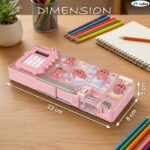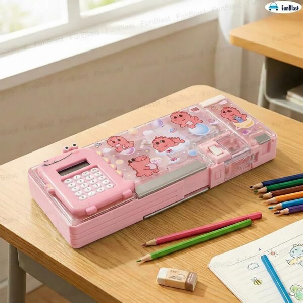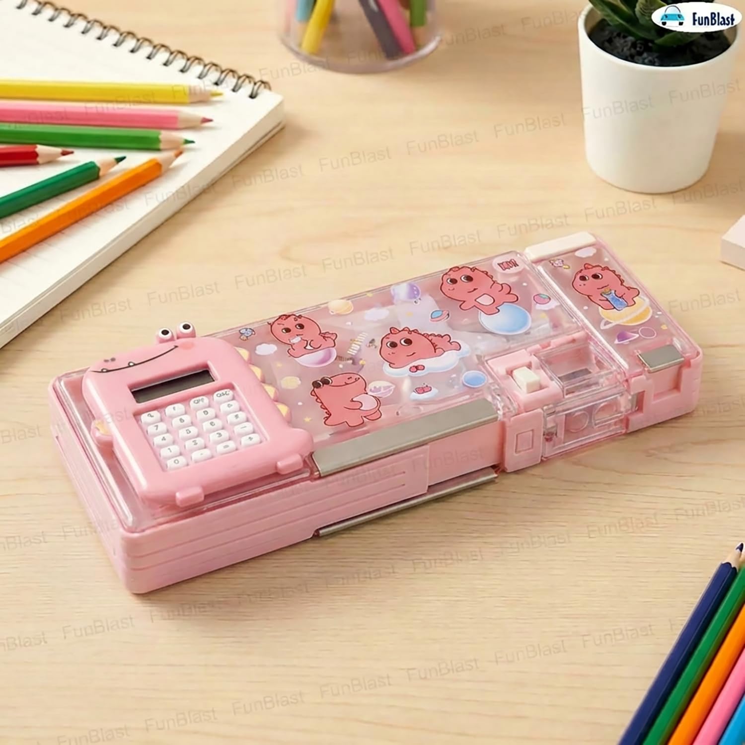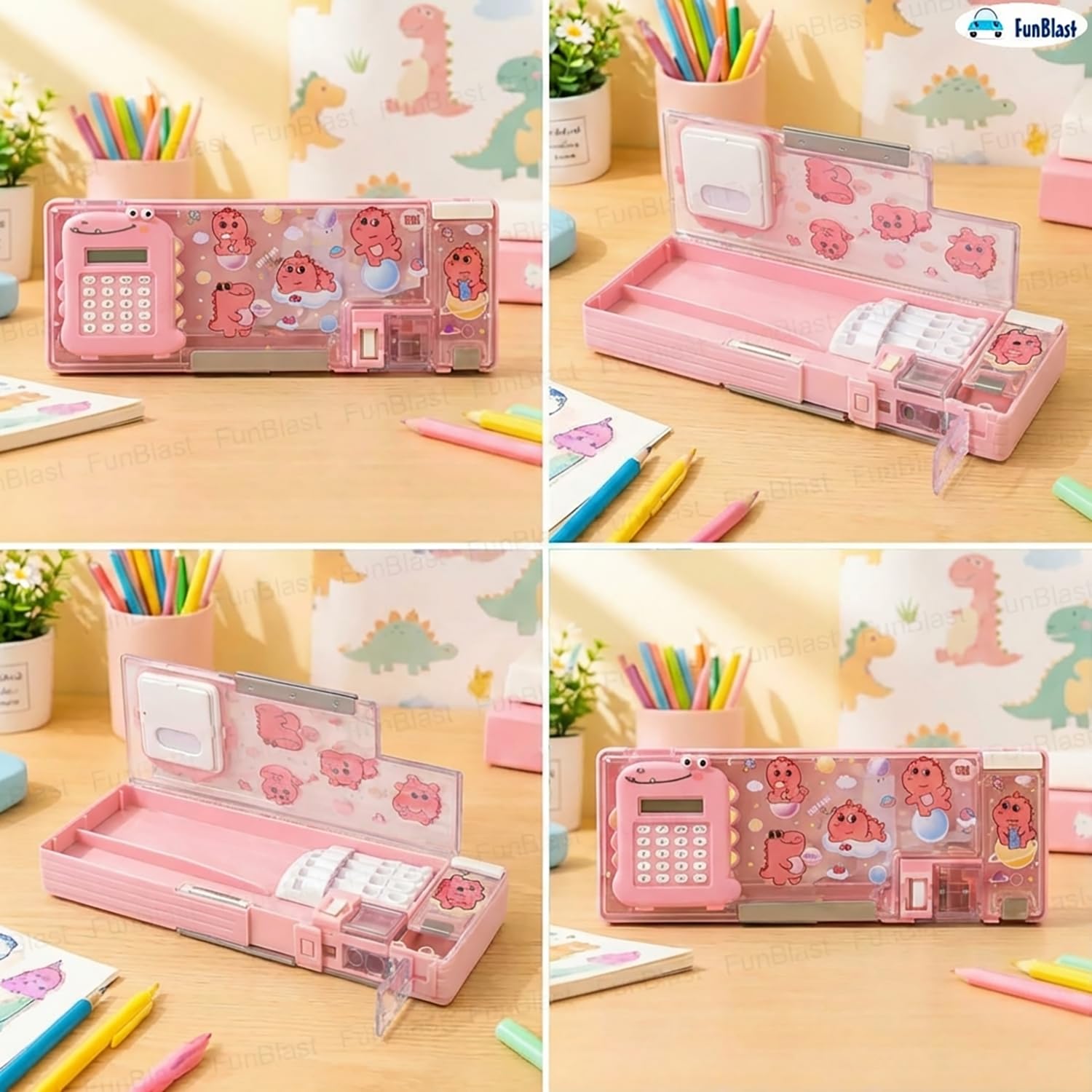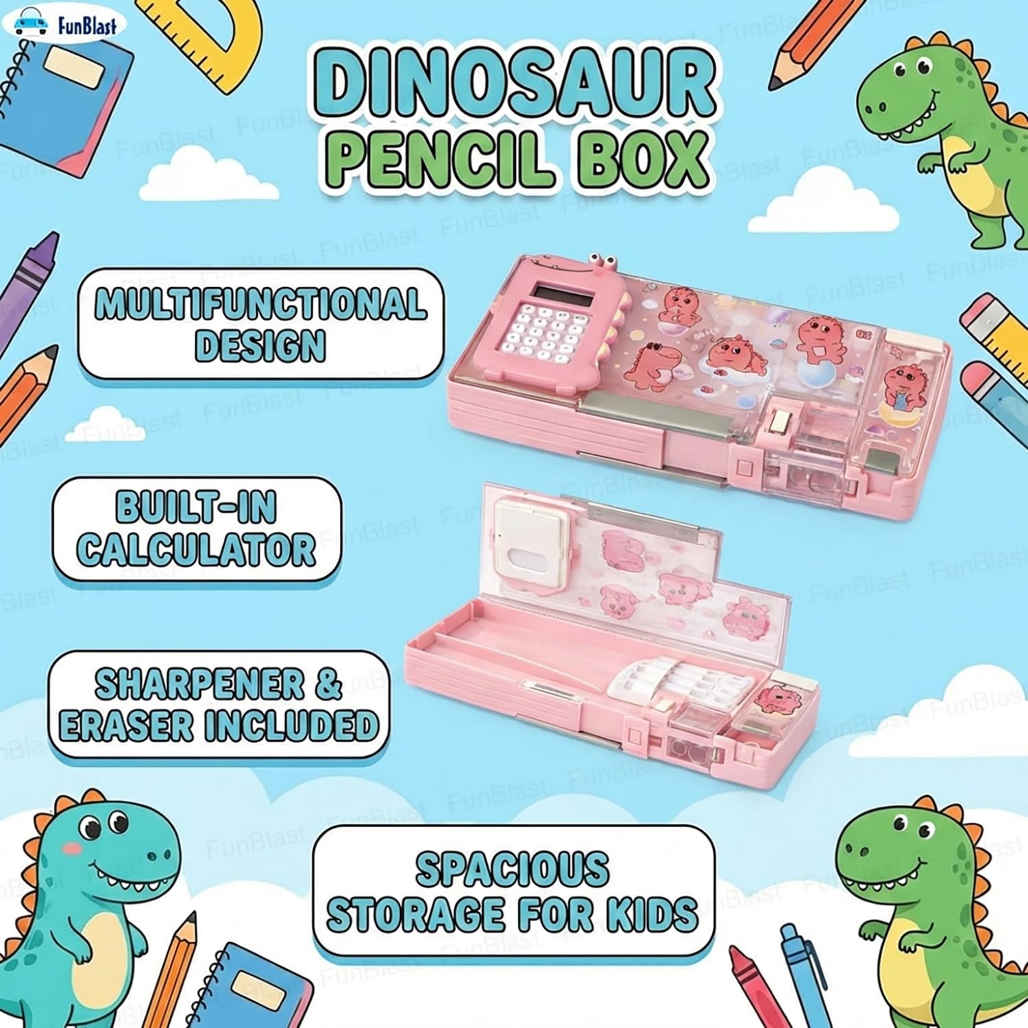 FunBlast DinosaurPencil Box with Calculator – Multifunctional Stationery Box with Sharpener, Eraser & Storage, Cute Cartoon Pencil Case for School Kids Stylish Pencil Box – FunBlast cartoon animal themed magnetic pencil box for kids is made of very high-quality material well designed: large capacity pencil case is very spacious and attractive Dimension: 23 X 8 X 3 Cm Features – Magnetic lock features with two side compartments, each one to pop out inbuilt sharpener, eraser compartment, with small led light additional compartment and pencil/pen holder Animal Pencil Box – This unique box can accommodate all the necessary stationery that your child would need to carry to school with separate slots for pencil, rubber, eraser, geometric set Multipurpose Stationary Organizer – This pencil box is the best stationary kit organizer for school going kids and children. Suitable for Nursery to secondary school children Best Stationary Gift – This cartoon themed pencil box is the best gift for toddlers, birthday gift for kids, return gift for children, can be gifted on any occasion
