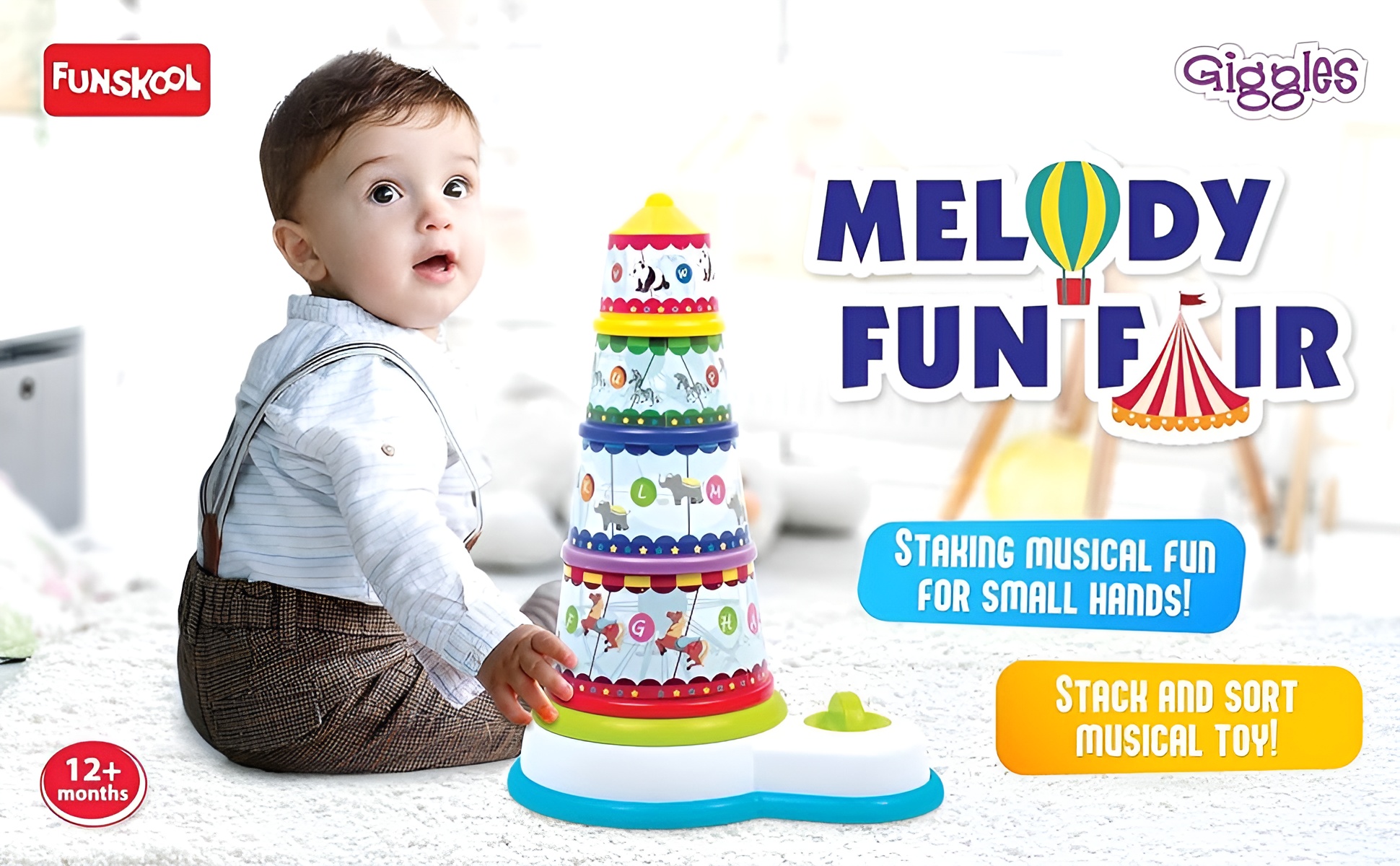Stack, spin, and play with the Funskool Giggles Melody Funfair — a vibrant musical stacking toy that helps babies 12+ months learn letters, colours, and rhythm while developing motor and sensory skills through engaging play.