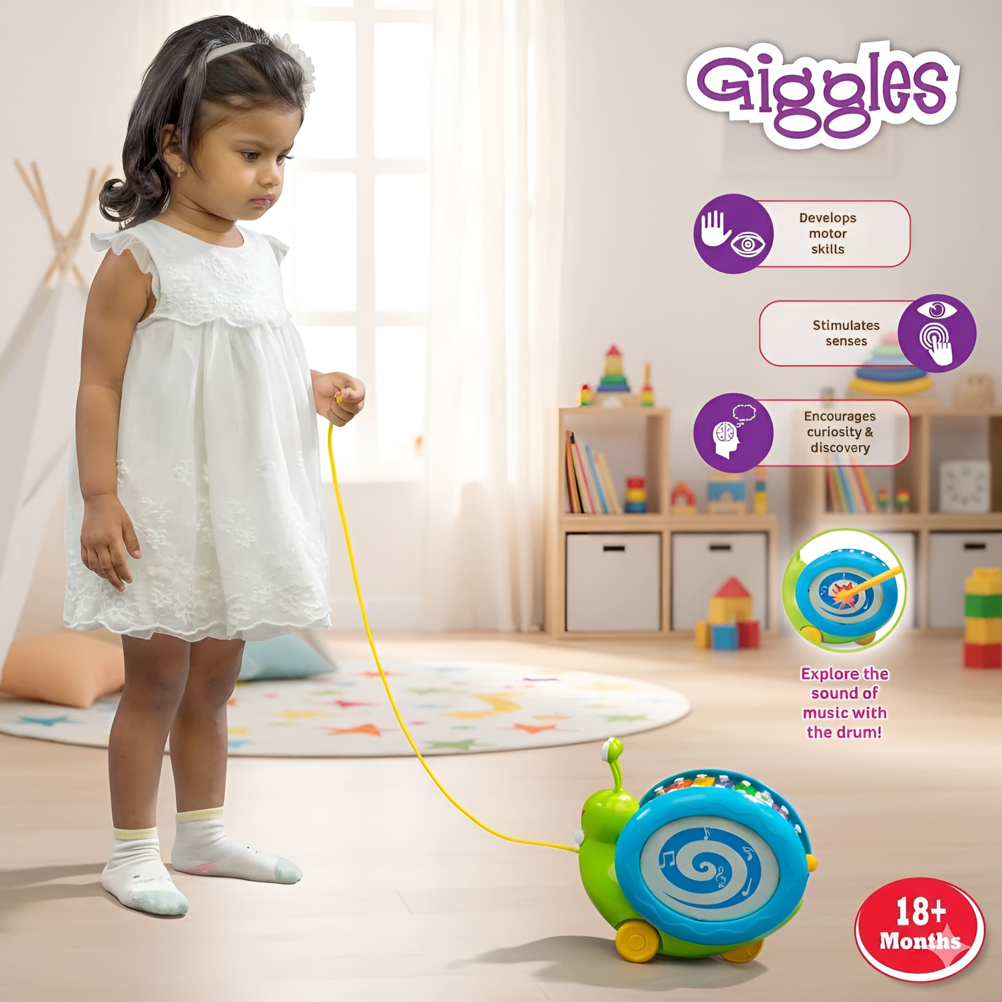 A vibrant 2-in-1 pull-along toy and musical instrument, the Funskool Giggles Musical Snail helps toddlers explore sound, rhythm, and motion. Designed to promote early learning, coordination, and sensory play, this charming musical snail turns every movement into a melody of fun!