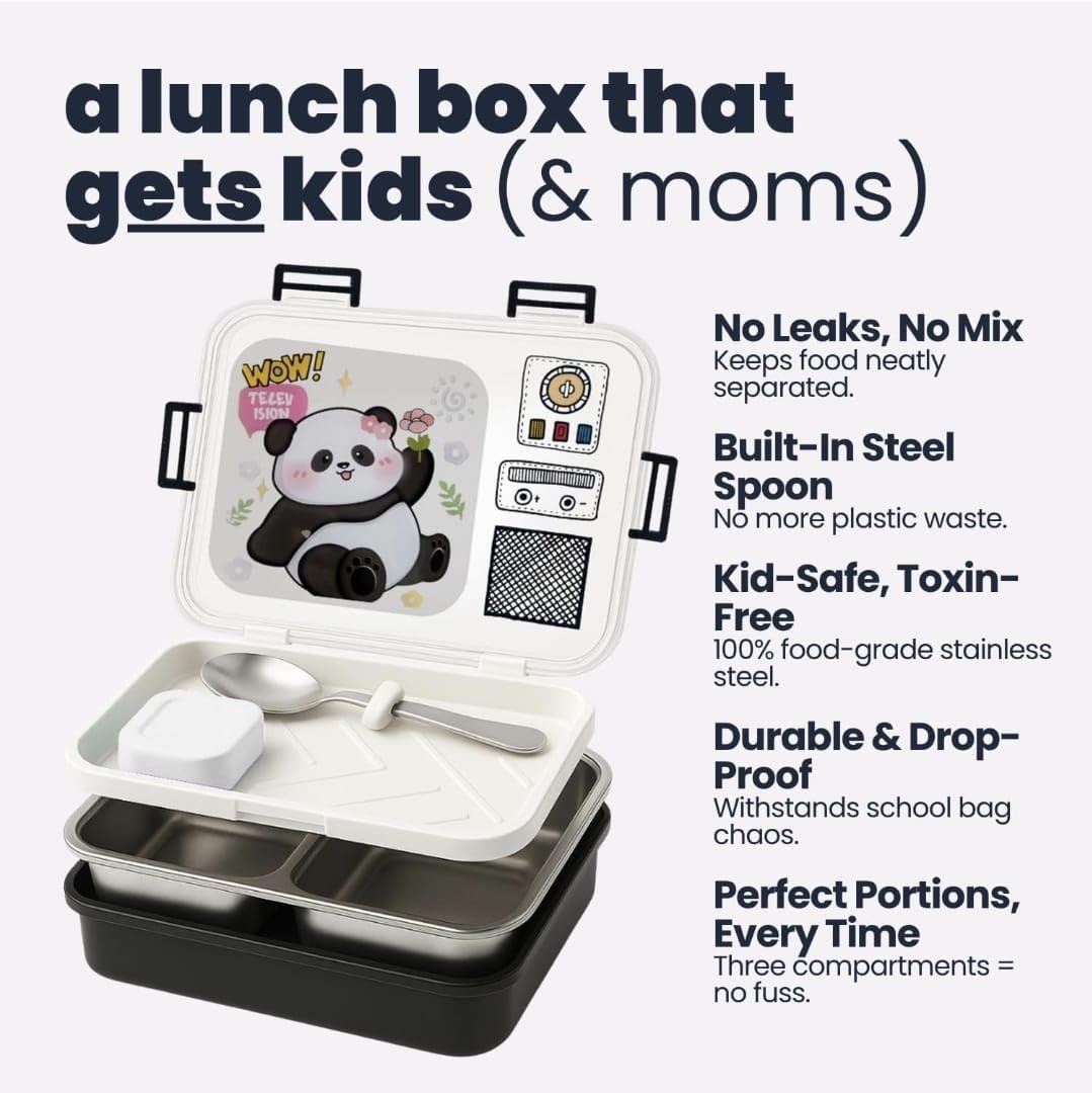 Gurnur Stainless Steel Bento Lunch Box, 2 Compartments, 750ml+70ml Capacity, Cute Panda Design, Black and White