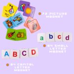 - 200 High-Quality Magnets: This set includes 200 durable magnets: 72 colourful picture magnets, 64 capital letter magnets, and 64 small letter magnets. Each piece is designed with vibrant images and bold letters to capture young learners’ attention, making learning fun and effective.