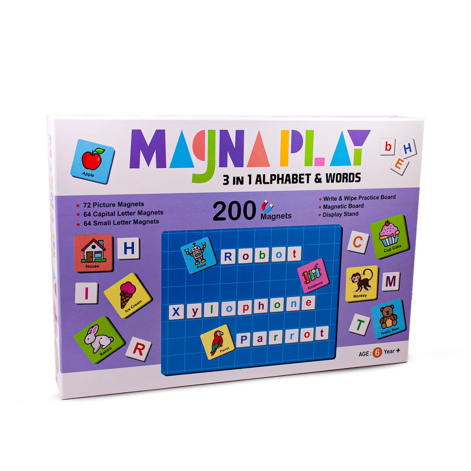 Toy Cloud Magna Play 3-in-1 Alphabet & Words Learning Kit for Kids with 200 Magnetic Pieces & Write & Wipe Board – Age 6+
