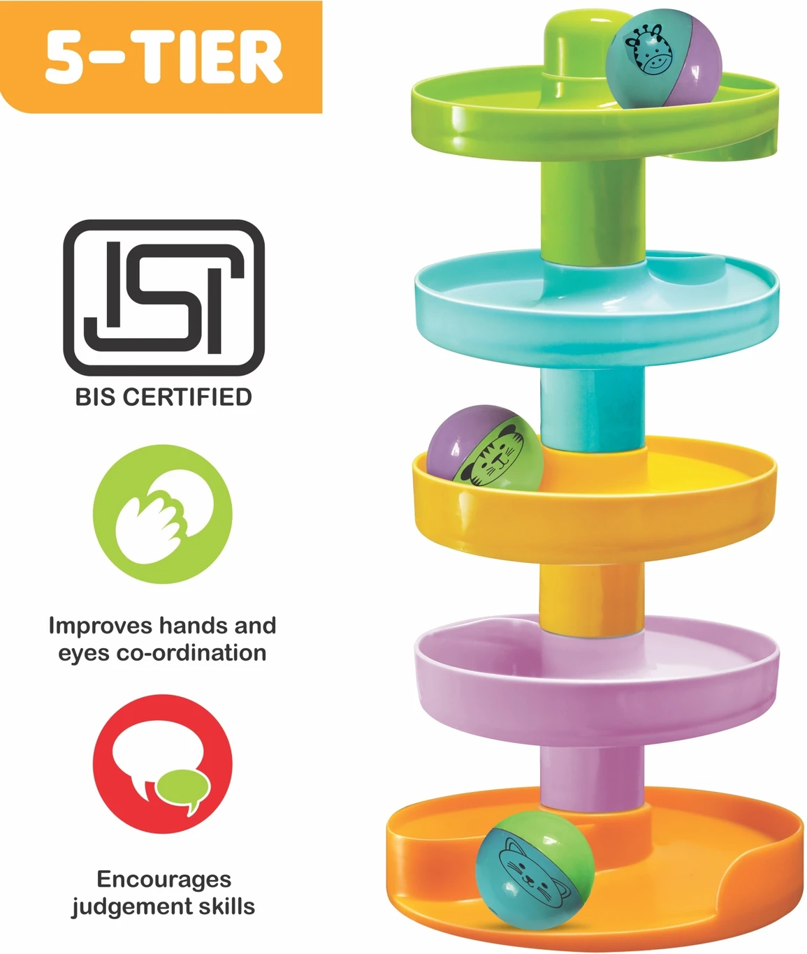 Contents: 5 Tiers & 3 Sound Making Assorted Color Balls